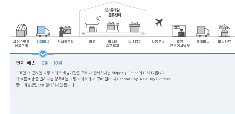 스페인 쇼핑몰에서 온라인으로 구매하신 상품을 현지 주소지에서 대신 수령해 고객님이 계신 한국의 주소지까지 배송해드리는 서비스입니다.